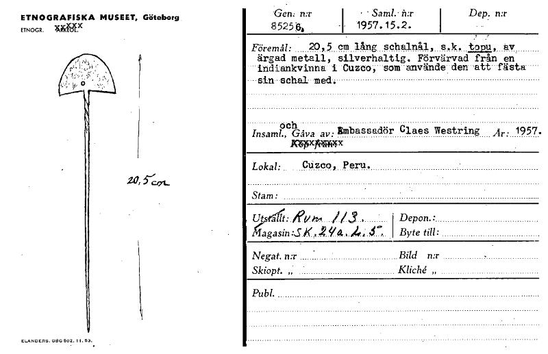 ETNOGRAFISKA MUSEET, Göteborg ETNOGR. VIEF.X ELANDERS. GG 502. 11.53. Gen: n:r I Sand. Dep. n:r 85250, -I 1957.15.2. .7 . Föremål: 20,5 cm lång schalnål, s.k. topu, av ärgad metall, silverhaltig. Förvärvad från en indiankvinna i Cuzco, som använde den att fästa sin schal med. och Insaml., Gåva av: Embassadör Claes Westring Är: 1957. lantrunx Lokal: Cuzco, Peru. Stam : uprairt:.42.k.n. // 3 , • kagasinux, A; Depon.: Byte till: Negat. n:r Bild n:r Skiopt. „ Kliché„ Publ. • [ocr]