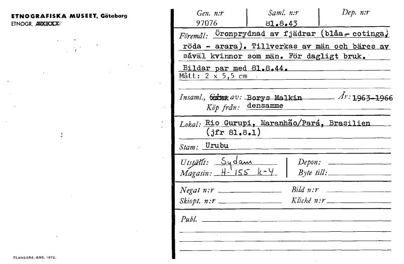 ETNOGRAFISKA MUSEET, Göteborg ETNOGR. INXECTOC• ELANDERS.GBB.1972. Gen. n:r 97076 Saml. n:r i 81.8.43 Dep. n:r . Föremål: Öronprydnad av fjädrar (blåaT.coting4 röda - arara). Tillverkas av män och bär...Visa hela