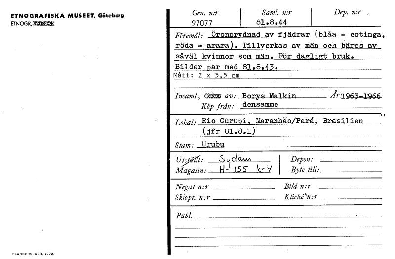 ETNOGRAFISKA MUSEET, Göteborg ETNOGR.~« ELANDERS.G98.1972. Gen. n:r 97077 i Saml. n:r 81.8.44 Dep. n:r , Föremål: ÖronprydnadJ___Ucatanga av f • ådrar (blåa - • röda - arara ) . Tillverkas av män och bäres av såväl kvinnor som män. För dagligt bruk. Bildar par med 81 .8.43. Mått: 2 x 5,5 cm Insaml., &Im av: Bnryg MalkanAl963-1966 Köp från: densamme Lokal: Rio GUrupi , Maranbio/Parå 9 Brasilien (jfr 81.8.1) Stam: Urubu Uts - t: .cli ci am" I Depon• Byte till: Magasin: 1-1- 155 (c •- Y Negat n:r Bild n:r Klich6'n:r Skiopt. n:r Publ. [ocr]Stäng