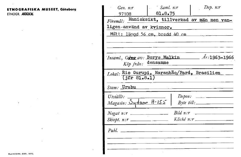 • ETNOGRAFISKA MUSEET, Göteborg ETNOGR. AMME:CX. ELANDERS,GBELI972. Gen. n:r 97108 I " Saml. n:r 81.8.75 Dep. n:r Föremål: Manioksikt, tillverkad av män men van- ligen,använd av kvinnor. Mått: längd 56 ... Visa hela