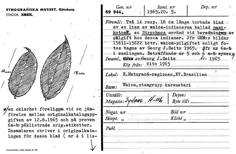 ETNOGRAFISKA MUSEET, Göteborg ETNOGR. /8 e-rn 7. /4 9/dAn oklarhet föreligga, vid en jäm- förelse mellan originalkatalogupp- giften av 12.8.1965 och på proven 6a-bh påklistrade orig. e tike tter . Insamlaren skriver i originalkata- logen för dessa blad ( nr 4 i lis- ELANDERS.GBG.8626.6.65 Gem n:r 89 944. . Saml.MT i 1965.20. 5. Dep. n:r Pirerna. Två 14 resp. 18 åm långa torkade blad av en. lian _av waica-indianerna kalladmami- kotom en Strychnos använd vid beredhinkai, pilgift hos dessa indianer. Jfr GEM:s bildhr 15611-15622. betr..waica=pilgiftet enligt fo- tos tagna av Georg J.Seitz 1965. jfr nr 6a,-. i samlingen...Beträffande-nr 5-och 6 a-b7, syns Insaml., 6~ av:Georg J: Seitz- År: 1965 Köp från: dito 1965 Lokal: R.Maturacå-regi °nen , DIV. Brasilien Stam: Waica, stamgrupp karauetari Utställt: Magasin: , - 4 I Depon: I Byte till: Negat. n:r Bild n:r. Skiopt. „ Kliché,, Full. • . [ocr]