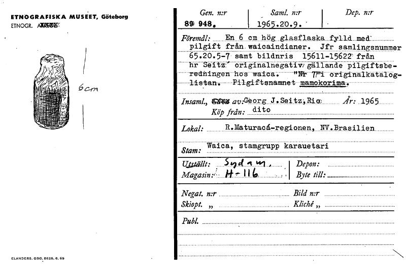 ETNOGRAFISKA MUSEET, Göteborg ETNOGR. aNZIP LANDERS. G8G. Gen. n:r 89) 948. . _ Sanzl. n:r 1 1965.20.9. ' Dep. n:r i • Föremål: En 6 cm h ö g glasflaska pilgift från.. waicaindianer. 65.20.5-7 samt bildnris hr Seitz:' originalnegativi redningen hos •Vitatou. listan. Pil gi ftsnamnet.. Insaml., 4104 av:Georg J. Sel Köp från: dito fylld med' Jfr samlingsnummo 15611-15622 från gällande pilgiftsbe• "Ni' rå. originalk * mamokorima. tz-, Rico År: 19.65 Lokal: R.Maturacå.-regionen, NV.Brasilien Stam: Waica, stamgrupp karauetari Ulf:/it: St.' 4 " kti , Magasin ../ - 14 °- 11 4 , , •I I Depon: Byte till: Negat. n:r Bild n:r Skiopt. „ Kliché,, Publ. , 6 c-rn [ocr]