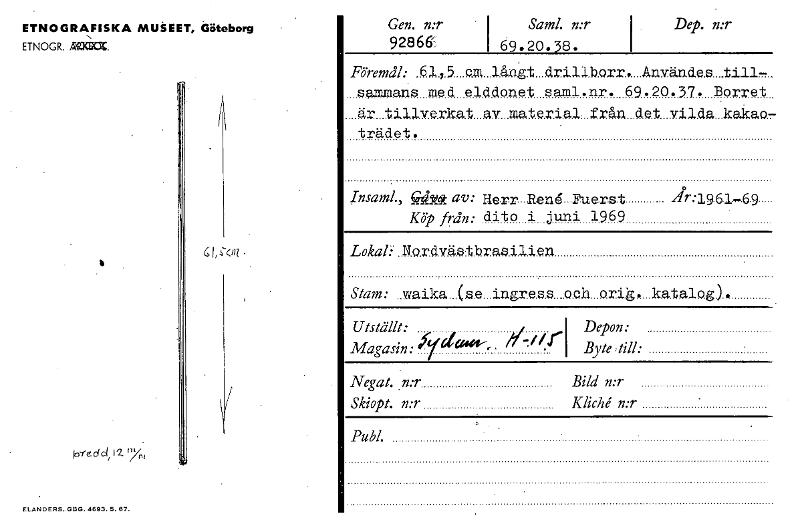 Gen. n:r I Saml. n:r 92866 I 69.20.38. Dep. n:r ETNOGRAFISKA MUSEET, Göteborg ETNOGR. =Cia. Föremål: .51,5 ... o.m_långt_drillborr,Användes_till- sammans med elddonet saml.nr. 69.20.37. Boret är tillverkat av material- ±'rån det vilda kakao.7 trädet. InsamL, eni524t av: Herr Rena Fuerst Kip från: dito i juni 1969 yir:1961-69 Lokal: ..No.ry.s1hras.i.ii.exi Stam: waika (se ingress .och orig. katalog). Utställt: Depon: Magasin: ''' "%J Byte,till: Negat..n:r Bild n:r Skiopt. n:r Kliché n:r Publ. frrdd 12. "7„., ELANDERS. GBG. 4693.5.67. [ocr]