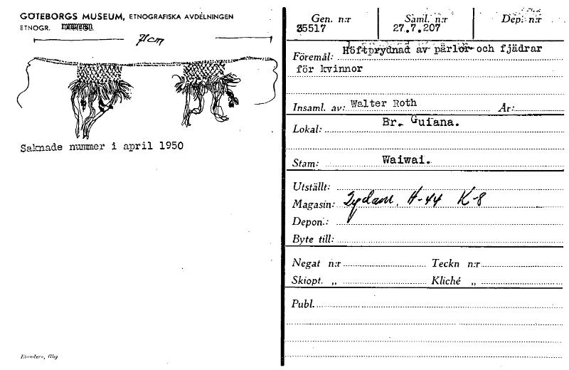 • GOTEBORGS MUSEUM, ETNOGRAFISKA AVDELNINGEN ETNOGR. 11~. h Saknade nummer i april 1950 Elynder8,(7,g Gem n:r 35517 Yamir'iiT 27.7. ()7. • Ei4)' n':r • * litAird6Å ali.Pärloch fjädrar Föremål: för kvinn... Visa hela