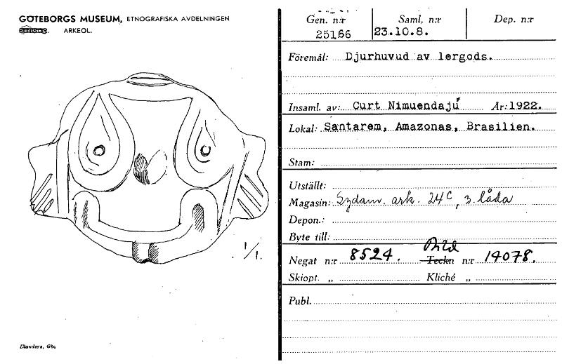 • GOTEBORGS MUSEUM, ETNOGRAFISKA AVDELNINGEN 6=933/123--- ARKEOL. Gen. n:r 25166 Saml. n:r 23.10.8. Dep. n:r Föremål: D.j.urhuv.u.d av lergods. Insaml. ay• Curt Nimu.endajj Ar:.1922, Lokal: Santarem,... Visa hela