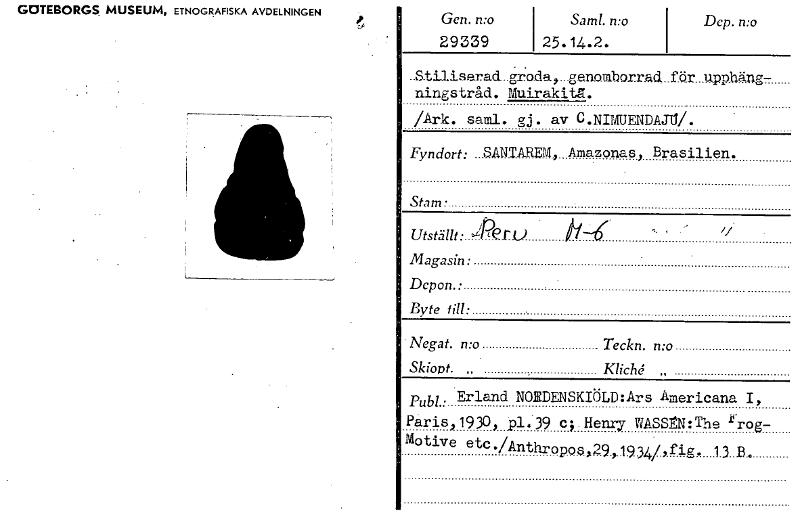• GOTEBORGS MUSEUM, ETNOGRAFISKA AVDELNINGEN Gen. n:o 29339 Saml.wo 25.14.2. Dcp. n:o • •Stiliserad_groda,...genomborrad_för_upphäng- j ningstråd. Muirakitä. /Ark. saml. gj. av C.NIMUENDAJ4/. Fyndort: _... Visa hela
