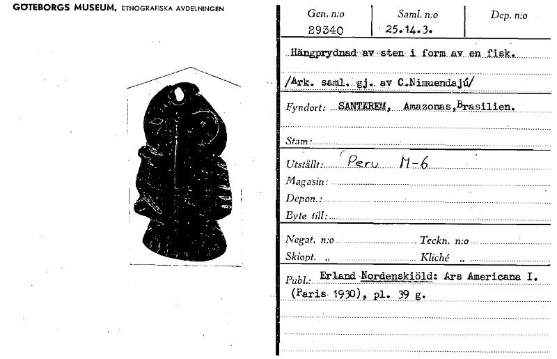 • Saml. n:o 25.14.3. GOTEBORGS MUSEUM, ETNOGRAFISKA AVDELNINGEN Dep. n:o Gen. n:o 29340 Hängprydnad' av sten i form av en fisk, /Ark. G.Nimuendaj Fyndort: SAN= Amazonas Brasilien. Stam • Utställt. r... Visa hela