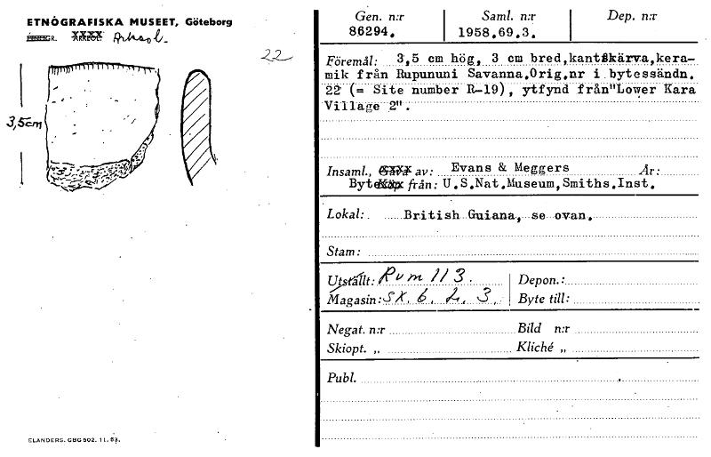 ETMÖGRAFISKA MUSEET, Göteborg 132559E R. WkM A>vh41.-0 Gen. n:r 86294, Saml. n:r 1958,69,3„ Dep. n:r Föremål: 3,5 cm hög, 3 cm bred,kantåkärva,kera- mik från Itupununi Savanna,Orig,nr i bytessändn, 22' (= Site number R-19), ytfynd från"Lower Kara Village 2". Insaml., 64Kic av: Evans & hieggers År: Byt~ från: U Mat .Mu.seum,Smiths„Inst. Lokal: British. Ouiana, se ovan, Stam: 3,5c-rri Ut allt: /Pli n't- 11 3. Magasin:SX, , Depon.: Byte till: Negat. n:r Bild n:r Skiopt. „ Kliche „ Publ. ELANDERS. GI3G 502. II. 53. [ocr]