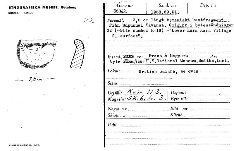 . , • -Gen..- n:r 86342. ISam!. n:r Dep. n:r i 1958.69.51: ETNOGRAFISKA MUSEET, Göteborg XIMPR. ARKEOL. Föremål: 3,5 cm långt kermiskt kantfragment. Från Rupununi Savanna. Orig.nr i bytessändningen 22...