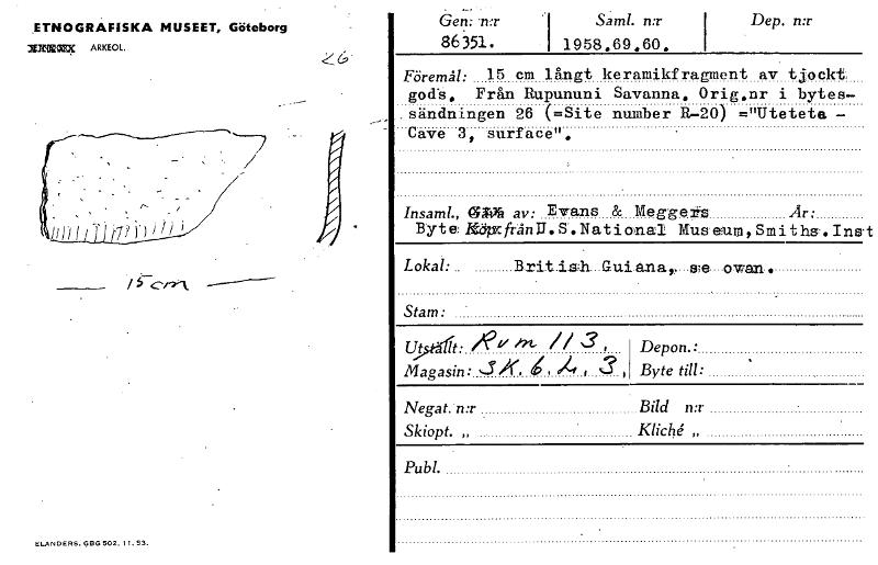 <6 Dep. n:r ETNOGRAFISKA MUSEET, Göteborg XrEMM ARKEOL. Gen: n:r 86351. Sam!. n:r I 1958.69.60. Föremål: 15 cm långt keramikfragment av tjockt; gods. Från llupununi Savanna. Orig.nr i bytes- . sändningen 26 (=Site nurober R-20) ="Uteteta - Cave 3, •surfame". Insaml., av: Evans & Meggets Är: 43» Byte ItgacfrånA. S. National Nuseum, Smitha. Inert Lokal: Britiah Guianar ovan. / Stam: Ut It: "fl/ "n- /131 Magasin: , , , Negat. n:r Skiopt. „ Depon.: Byte till: Bild n:r Kliché „ Publ. ELANDEI15.913G502.11.53. [ocr]Stäng