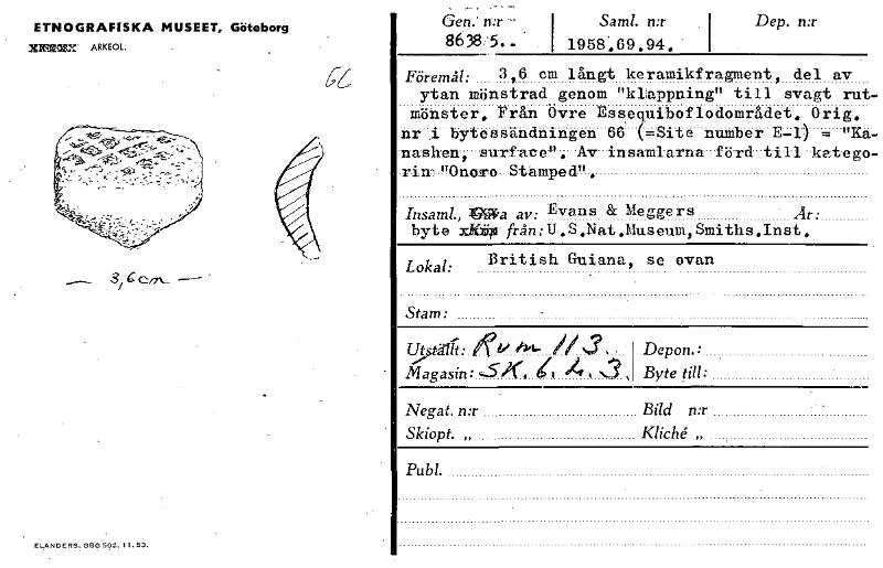3/ C C/7\_ Gen: n:r - Samt. turDep. n:r 8638:5. - I 1958..69.94. 1 Föremål: 3,6 em långt keramikfragment, del av ytan mönstrad genom "klappning" till svagt rut- mönster. Från Ovre Essequiboflodomradet. Orig. nr .i bytessändningen 66 (=Site number E-1) = "Ka- nashen, surface". Av insamlarna förd till katego- rin' "Ono ro Stamped", Evans & Meg,gers Insaml., 49ffa av: E Ar: byte xifflia. från :U .S .Nat Mus own, Smiths „Inst Lokal: British Guiana, se ovan ETNOGRAFISKA MUSEET, Göteborg 211023= ARKEOL. Stam: Utstädt: /59/✓ /73,• Magasin fix, , Depon.: Byte till: Negat. n:r Bild mr Skiopt. „ Kliché „ Publ. ELANDERS. GRG 592. II. 53. [ocr]
