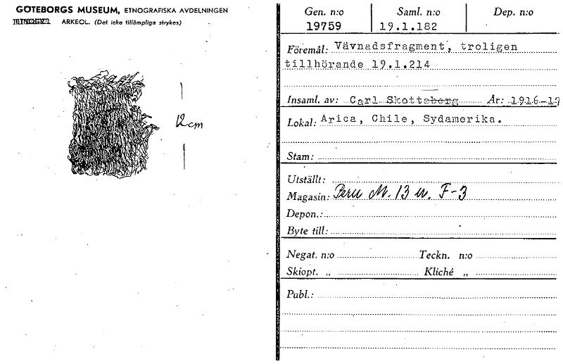 • Dep. n:o GOTEBORGS MUSEUM, ETNOGRAFISKA AVDELNINGEN namna ARKEOL. (Det Icke tillämpliga sfrykes) Gen. n:o 19759 Sam!. n:o 19 .1.182 Föremål: Vävnadsfragment troligen tillhörande 19.1.214. Insaml. av:... Visa hela