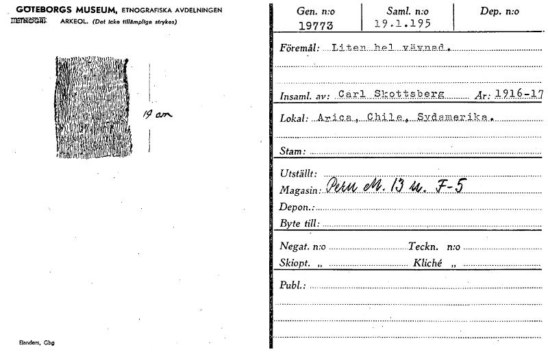GOTEBORGS MUSEUM, ETNOGRAFISKA AVDELNINGEN =MC ARKEOL. (Det Icke tillårnpliga strykes) /g ad". Elanders, Gbg Gen. n:o 19773 Saml. n:o 1 19 o i .195 Dep. n:o FöremåL ....Liten . . .. .h.el....v.,liv.nad . Insaml. av: Cårl Slzottsberig Är; 1916-17 Lokal: A.,-.1.Qa.., Chil.e.. syclern.erikn, Stam: Utställt: Magasin: ~ A, /3 4. Depon.• Byte till: Negat. n:o Teckn. n:o Skiopt. „ Kliche' „ Publ.: [ocr]