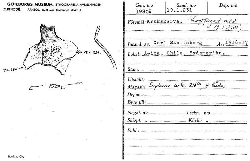 Elanders, Gbg Utställt: Magasin: Depon.: Byte till: ,S-rutAx, 0,14, Gail' efAUt) GOTEBORGS MUSEUM, ETNOGRAFISKA AVDELNINGEN razt~ ARKEOL. (Det Ieke tillåmpliga strykas) Gen. n:o 19809 Saml. n:o 19 .1.231 Dep. n:o Föremål:Krukskärva. • -)-0-1 • i A-2_5 Insaml. av: Carl Skottsberg Lokal: A-rica , Chil e, Sydamerika. Stam: Negat. n:o Teckn. n:o Skiopt. „ KlicU Publ.: Är:1916 -17 [ocr]
