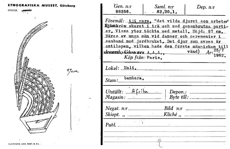 ETNOGRAFISKA MUSEET, Göteborg ETNOGR. .0401(441! ELANDERS.GSG.5687.EL61.. Gen. n:r 88256. Saml. n:r i , . ,62.20 ..1 a Dep. n:r I • . Föremål: tji wara, "det i trä -.och vilda djuret metall._ Det djur den första, med zenombrutnati som arbeta: Höjd• 97 cm,___ ceremonier i s'om. avses är människan til vänd) Är:25/7 lijiititikrö_m_5kuret ...ex...__Yiis.s.a ,,,,,, täckta med __Bäre.s.._av anga..män vid danser:och __samband_med jordbruket. ...antil_o_pen,...viiken, bade slyasettilvceximaKånex___A„A_.1„, Köp från: Paris. 19b2. Lokal: Mali, bambara. Stam: , . Utställt: 4 ■ VO, - Byte till: Depon.: Magasin: • Negat. wr Bild n:r Skiopt. „ ________KlicH „ Publ. - [ocr]