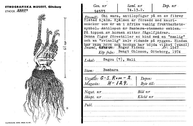 ETNOGRAFISKA MUSEET, Göteborg ETNOGR. AU951c.x ELANDERS. GBG. 4693. 5. 67. Gen. n:r 94573 Saml. n:r 1 74.13.2. Dep. n:r I Före °1: Chi wara, antilopfigur på-en av fibrer rlätad hjälm. Hjälmen ar forse...