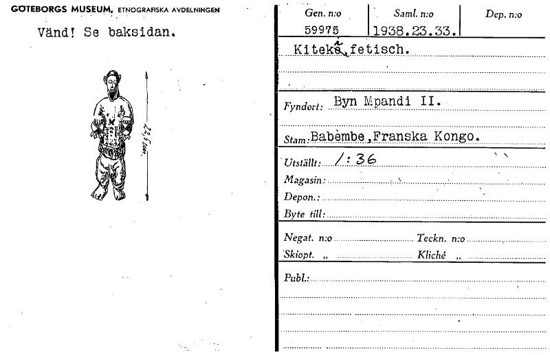 • GOTEBORGS MUSEUM, ETNOGRAFISKA AVDELNINGEN Vänd! Se baksidan. 59975 11938.23.33.1 Kitekkfetisch. Gen. n:o Saml. n:o Dep. n:o Fyndort: Byn Mpandi II. stam .Babembe Franska Kongo. Utställt: /:36 Magas... Visa hela