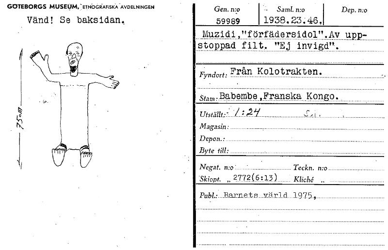 • ' e Muzidi,"förfädersidol".Av upp- stoppad filt. "Ej invigd". Fyndort:Från Kolotrakten. stam.Babembe,Franska Kongo. Magasin • Depon. • Byte till: Negat. n:o. Teckn. „ 2772(6:13) KlicH Skiopt. :,2/1... Visa hela