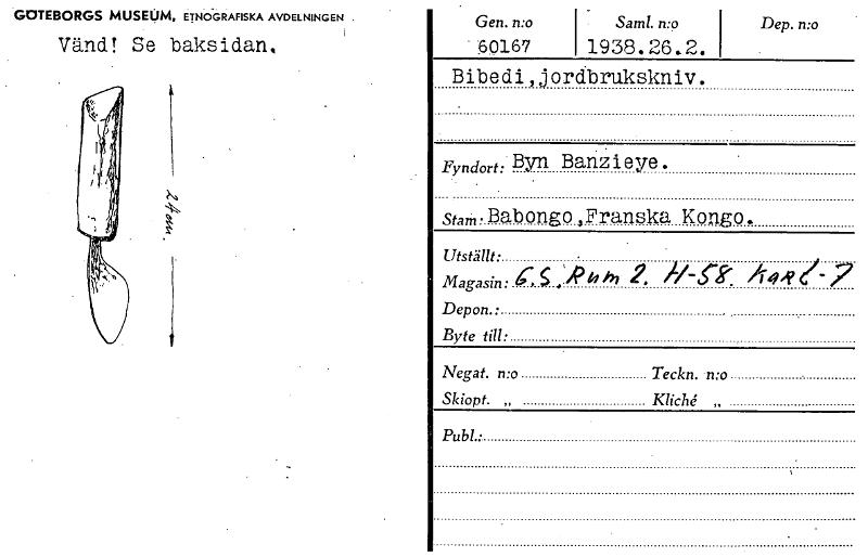 • GOTEBORGS MUSEIPM, ETNOGRAFISKA AVDELNINGEN . Vänd! Se baksidan. Gen. n:o Samt. n:o Dep. n:o - :60167 1938.26.2. Bibediliordbrukskniv. Fyndort:BYT-1 Banzieye. stam.Babongo4Franska Kongo. Utställt: Mag... Visa hela