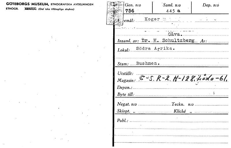 • GOTEBORGS 'MUSEUM, ETNOGRAFISKA AVDELNINGEN ETNOGR. KREIMD. (Det Icke strykes) 756 • 445 a Gen. n:o Saml. n:o Dep. n:6 emål: Koger •. _ _ Gåva. Insaml. av: .tr.. .S.ohult.z.b.e.rg... Ar: Lokal: Södr... Visa hela