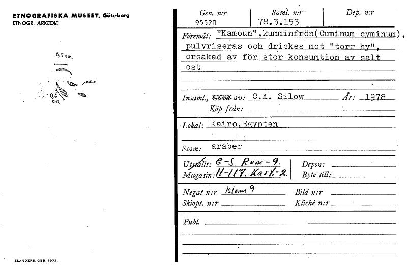 • ETNOGRAFISKA MUSEET, Göteborg ETNOG R. MMI.0 0, '‘.K ELANDERS.GBil.1972. Gen. n:r 95520 Saml. n:r I 78.3.153 i Dep. n:r Föremål: "Kamoun",kumminfrön(Cuminum cyminum pulvriseras och drickes mot "torr h... Visa hela