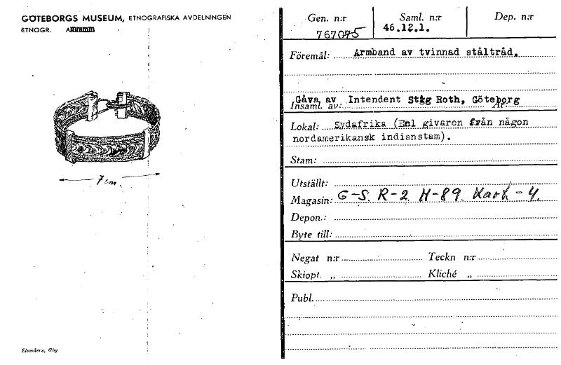 GOTEBORGS MUSEUM, ETNOGRAFISKA AVDELNINGEN E TNOGR. ARIMMIII • Elanders, GNI Ge7n6. 7notil.r:r i 4 .6 .Siaem.li ,in : r Dep. n:r Föremål: Armband av tvinnad ståltråd, _ heavrä aavv: Intendent Stkg Ro...