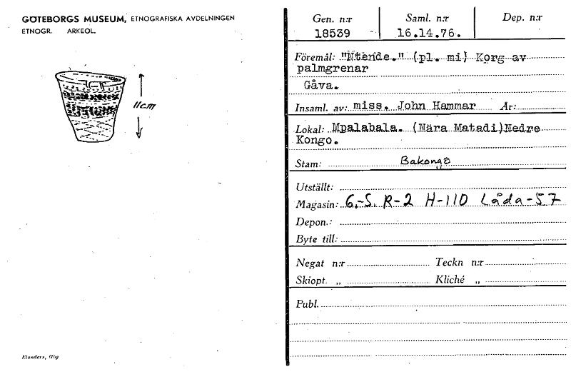 • GOTEBORGS MUSEUM, ETNOGRAFISKA AVDELNINGEN ETNOGR. ARKEOL. Elgmders,G9 Gen. n:r 18539 - Sam!. n:r 16.14.76. Dep. n:r : Föremål: Yittericle.." (p1-. mi)- -Korg- av palmgrenar : Gåva. , hisamL av: miss... Visa hela