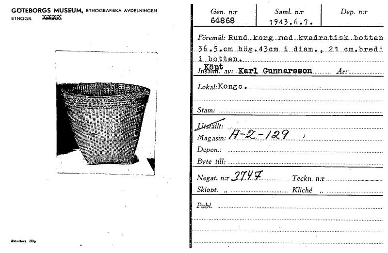 • GOTEBORGS MUSEUM, ETNOGRAFISKA AVDELNINGEN ET NOGR. Gen. n:r 64868 Saml. n:r 1943.6.7. Dep. n:r Föremål: Rund...korg...med...kvad.r.a t.i.s.k....b.o.tten ingp. av: ICarl arstson Ärr Lokal:Kongo . Sta... Visa hela