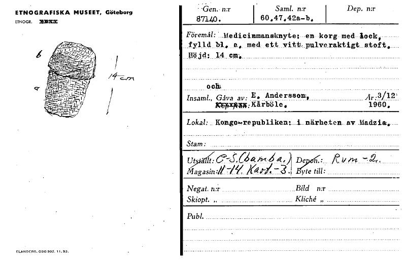 ETNOGRAFISKA MUSEET, Göteborg ETNOGR. XXCEMC -Gen. n:r 87140. Sam!. n:r 60,47,42a—b, Dep. n:r Föremål: Medicinmansknyte: en korg med lock, fylld bl. a, med ett vitt, pulveraktigt stoft. Höjd; 14 cm,, och., Insaml., Gåva av: .3/12' E. Andersson, År poxikzuf Kårböle. 1960, Lokal:.. Kongo—republiken: i närheten av Madzia. Stam: Ut It:C.--k.S.,a4kM- 4e) D n.: Magasin://:—/V. »tji - 3 yte till: Negat. n:r Bild n:r Skiopt. „ Kliché „ Publ. Se ELANDERS. 000 502. 1.53. [ocr]