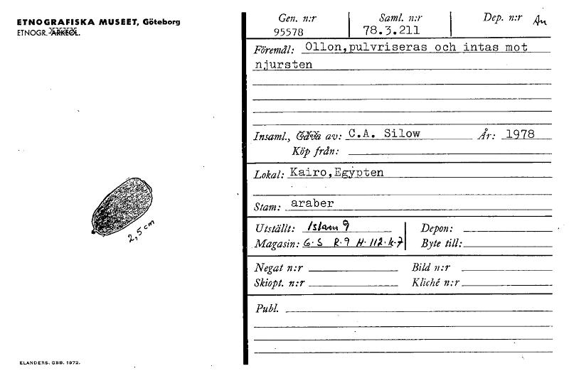 • ETNOGRAFISKA MUSEET, Göteborg ETNOG R. 3Agfää. ELANDERS,GBEL1972. Gen. n:r 95578 8a .2. lnl:rI 78 .3"11 Dep. n:r Föremål. 011on,pulvriseras och intas mot njursten Insaml., U.4% av. . C.A. Silow jr- 19... Visa hela