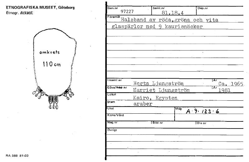 • ETNOGRAFISKA MUSEET, Göteborg Et nogr. År2-årtl: RA 588 81,D3 Gen.nr 97227 Saml.nr 81.18.4 Dep.nr Föremål Halsband av röda,gröna och vita glaspärlor med 9 kaurisnäckor Insaml av lAr Herta Ljungström C... Visa hela