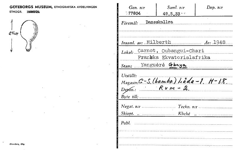 GOTEBORGS MUSEUM, ETNOGRAFISKA AVDELNINGEN ETNOGR. ~Ma Gen. n:r 77804 Sam!. n:r 49.5.33 —c Dep. n:r Föremål: Dansskallra Insaml. av: Hilb ert h Är: _1948 Lokal: Carnot, Oubangui-Chari Franka Ekvato...