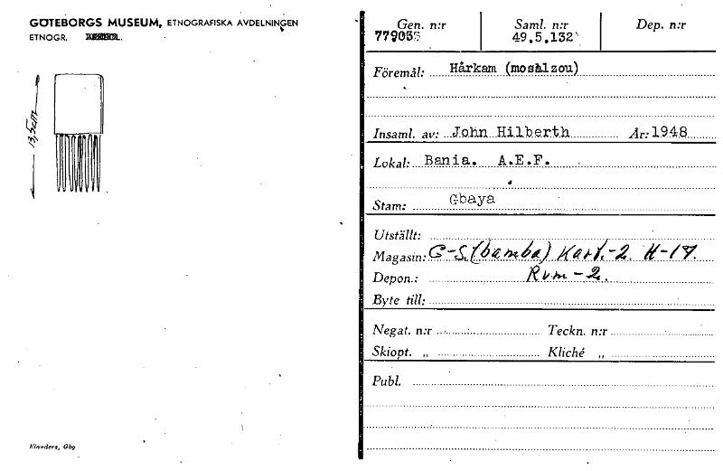• GOTEBORGS MUSEUM, ETNOGRAFISKA AVDELNINGEN ETNOGR. Rom.. Gen. n:r 779035 Saml. n:r 49.5.132' Dep. n:r Föremål: Hårkam (mosålzou) Insaml. av: ...J.0.13n Ar:1948 Lokal: Ban i a. A.E.F. e G Stam: baya ... Visa hela