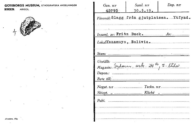 • Gen. n:r Samt. n:r 45795 30.5.19. Dep. n:r GOTEBORGS MUSEUM, ETNOGRAFISKA AVDELNINGEN 1921taa. ARKEOL. Föremål: Slagg från Ytfynd_. Insaml. av: Zr.i.t.z....Buck... År: Loka/Z.a.aa.muy ... B.oliv.i.a... Visa hela