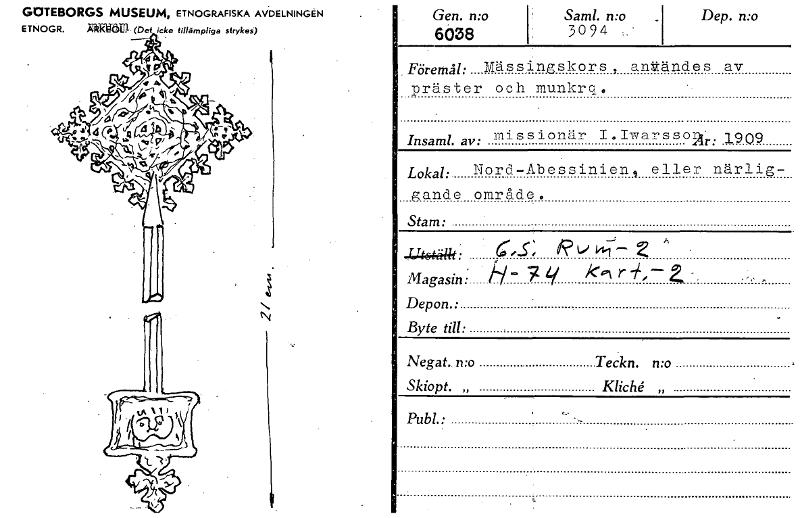 GOTEBORGS MUSEUM, ETNOGRAFISKA AVDELNINGEN ETNOGR. gRarde (Det icke tillämpliga strykas) N Gen. n:o • 6038 , Sam!. n:o _ , 3094 ,.. Dep. n:o Föremål: Mässingskors, anttändes av präster och munkrq. Insaml. av: missionär I . Iwarssopir• ; .1909 Lokal: Nord-Abessinien, eller närlig- gande område. Stam: . A 4.4441,1t: ,S; R iiii - 2 Magasin • 7 i.,/ /(,,, r ii., Depon.: Byte till: Negat.. n:o Teckn. n:o : Skiopt. „ Kliché „ Publ.: --- . [ocr]