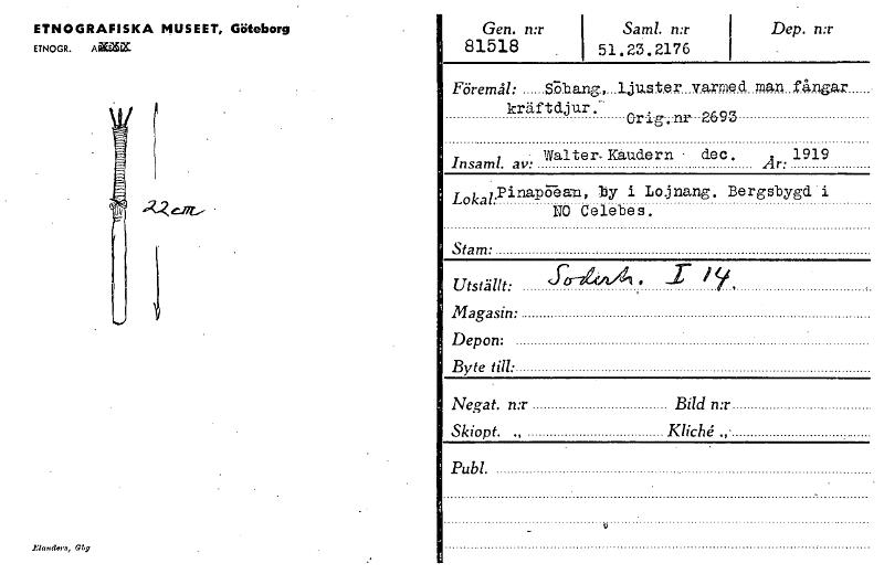 • ETNOGRAFISKA MUSEET, Göteborg ETNOGR. AKE1SX Gen. n:r Saml. Dep. n:r 81518 51.23.2176 Föremål: 5761:lang., ljuster ..3rarnie d man fångar kräftdjur er ig „nr 2693 Insaml. av: Walter. Kaudern dec. Är... Visa hela