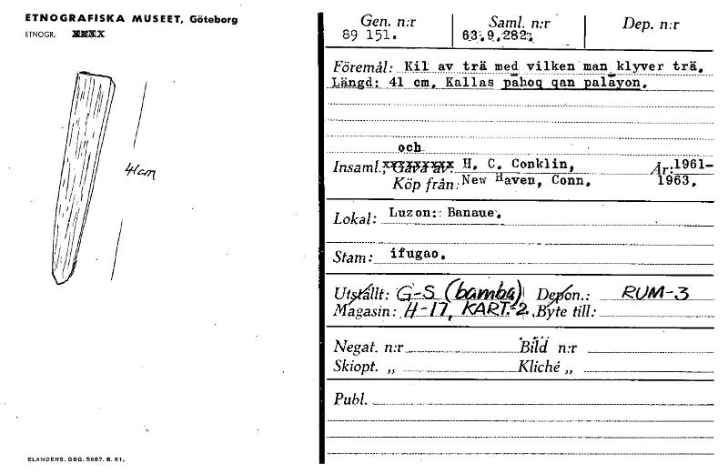 ETNOGRAFISKA MUSEET, Göteborg ETNOGR. SIX ELANDERS. GBG. 5687. 8.61. Gen. n:r 89 151. i Saml. n:r 6:3:.9.2821 i Dep. n:r Föremål: Kil av Längd; 41 cm. Kallas och. Insam1.2,9311~ Kipfrån:New trä med ...