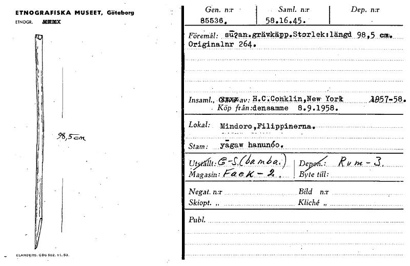 ETNOGRAFISKA MUSEET, Göteborg ETNOGR. Egna Gen. n:r • 1 - Sam!. mr 85536. I 58.16.45. Dep. n:r Föremål: sir?an. grävkäpp. St arl ek : längd 98,5 caj. Originalnr 264. hisamL, COIRKXav: H. C .Conklin ,New York 2957-58 . Köp ftån :densamme 8.9.1958. Lokal: Mindoro ,Filippinerna. - Stam: yagaw hanun6o. De le k - 3, Byte till: Ut Magasin: Faeisc- Negat. n:r Bild n:r Skiopt. „ Kliché „ Publ. cen. ELANDERS. GBG 502. 11. 53. [ocr]