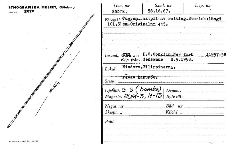 ELANDERS. GBG 502. 11. 53. Depon.: Byte till: Bild n:r Kliché „ Gen. n:r I Saml. n:r 85578, I 58.16.87. Dep. n:r Föremål: 9ugytu),Jaktpil av rotting•Storlekslängd 101,55 cm.Originalnr 445. Insaml„ e29h av: H.C.ConkliniNew. York A/1•577.5.8 Köp från: :densamme.. 8.9.1958. Lokal:Mindoro,Filippinerna. — yagaw•tanun6o, Stam: 454/it: G - $ (bamba) magasin: .Rom-3., H- l3 Negat. n:r Skiopt. „ Publ. ETNOGR. ETNOGRAFISKA MUSEET, Göteborg Ariggig [ocr]