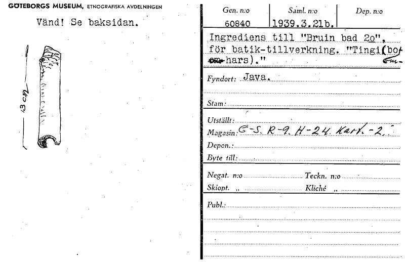 • GOTEBORGS MUSEUM, ETNOGRAFISKA AVDELNINGEN Vänd! Se baksidan. Gen. n:o SaMl. n:o Dep. n:o 60840 1939.3.21b. Ingrediens till "Bruin bad 2o", för batik-tillverkning. :v".Tingi(bc -hars)." Fyndort: Jav... Visa hela