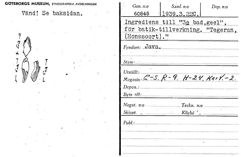 GOTEBORGS MUSEUM, ETNOGRAFISKA AVDELNINGEN Gen. n:o Sänd. n:o Dep. n:o Vänd! Se baksidan. T L 60848 '1939..3.22C. Ingrediens till "32 bad,geel", för batik-tillverkning. "Tegeran, (Honssoort)." Fyndo...