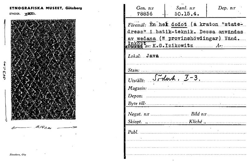 • ETNOGRAFISKA MUSEET, Göteborg ETNOGR. XXBOL. Gen. n:r Saml. n:r 78856 -•- 50.15.4. Dep. n:r FöteMål: tdhei do4öt (ä kraton "state;- A.rtasn i hatik,teknik._Dessa_användas_ avAvedana_.(.; ... provina... Visa hela