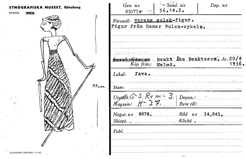 • - - , - Gen. -n:r —Samt. nr 85077f•56.14.2. Dep. n:r ETNOGRAFISKA MUSEET, Göteborg ETNOGR. ELANDERS,0130502.11.53. Depon.: Byte till: Ut sidlit..G--Si agasin : Föremål: Wavape golekl4igur. Figur från ... Visa hela