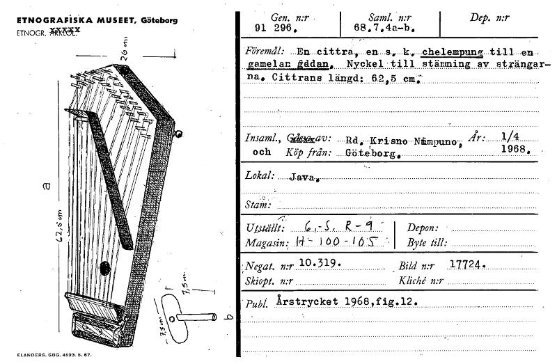 Gen. n:r 91 296, Saml. n:r 68.7.4a—b, Dep. n:r ETNOGRAFISKA MUSEET, Göteborg ETNOGR. YUCKY (CJ N Föremål: _En_cittra_r_en_e„k„chelempung till- en. gamelan gddan, Nyckel-till stämning av strängar- na, Cittrans längd: 62,5 cm,- Insaml., hav: .Rd. Krisno-Ndimpuno-t, jr" 1/4 och Köp från: G.öte.b.o.rg, 1968. Lokal: Java. Stam: Utställt: (p f- S f k - - I Depon: Magasin: H I ö - i ö '.5"- Byte till: :Negat. n:r 10•319• Bild n:r 17724. Skiopt. n:r Kliché n:r puh/ Årstrycket 1968,fig.12. ELANDERS. GSG. 4693. 5. 67. [ocr]