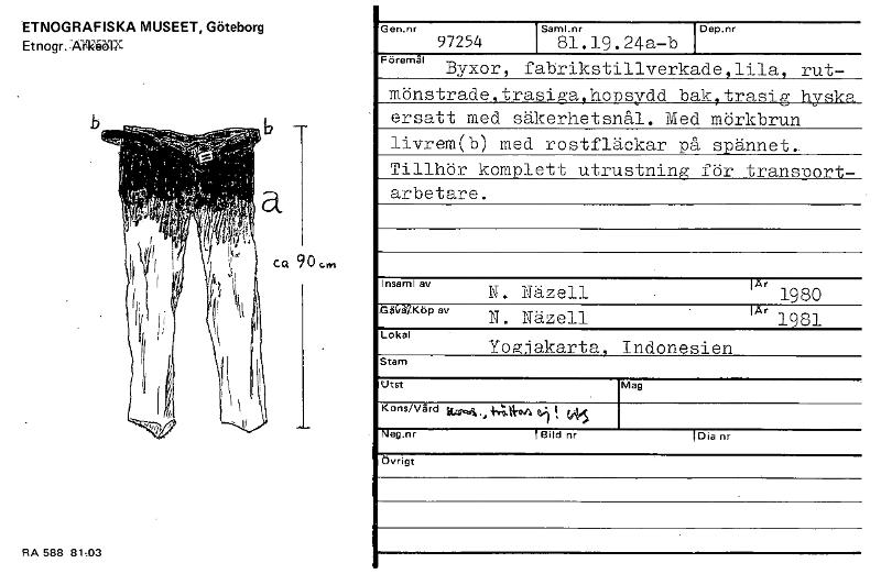• ETNOGRAFISKA MUSEET, Göteborg Et nogr.-A71ä61?: RA 588 81,03 Gen.nr 97254 Saml.nr 81.19.24a-b Dep.nr Föremål Byxor, fabrikstillverkade,lila, rut- mönstrade,trasiga,hopsvdd bak, trasig hyska ersatt med... Visa hela
