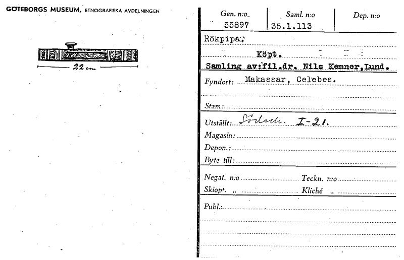 • GOTEBORGS MUSEUM, ETNOGRAFISKA AVDELNINGEN Gen. 55897 Rökpip.;' Saml. n:o 35.1.113 . Dep. n:o Köpt* &samling avifil.d,r. Nils remnergamd. Fyndort: Makassar, Celebes. Stam: Utställt Magasin: Depon. • ... Visa hela