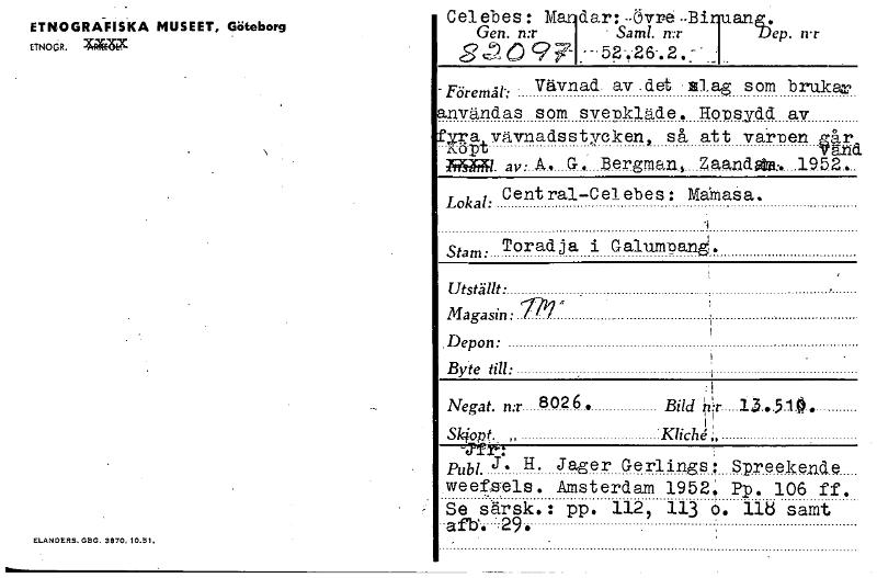 ETNOGRAFISKA MUSEET, Göteborg ETNOGR. 4RXEWC ELANDERS.GBG. 3570. 10.51. Gen. n:r Bä, ö 97 ueleues: marciar:-ovre-ta Saml. n:r —52,26.2:: ang. Dep. •r - Föremål: Vävnad av . det E1 ag som brukar znvändas som svepkläde. Hopsydd av 'at v vävnads s tycken, så att varpen går. öpänt ggggl. ay: 4,. G . Bergman, Zaandaln... 1952 . Lokal: Cent ral-C el ebes : MarnaSa. Stam: Torad ja i Galum-cang. Utställt. . Magasin: i Depon: ! Byte till: :l Negat. n:r 8026 , Bild iir 13.510. Skiopt. „ Klich ' , — ---M41 J. H. Dager Ge rl Publ. J ings : Spreekend e we ef.sels . Amsterdam 1952: Pp. 106 ff. . Se särsk.: pp. 112, 113 o. 11b samt a fb'. 29. [ocr]