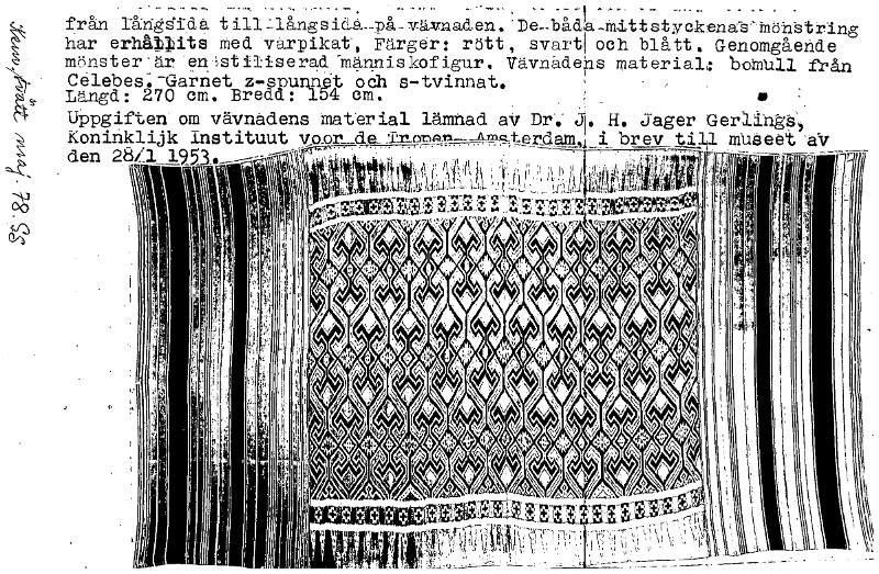 från Iåriggida till-LlångsiLa__på.-växrnaden. De--b&da-m-ittstyckena-s-Mön-string har erhållits med. värpikat, Färger: rött, svart, och blått. Genomgående mönster-är en 'stiliserad "människofigur, Vävnadens material: benan från Celebes.-Garnet z-spunnet och s-tvinnat. k Längd: 270 cm. Breda: 154 cm. to - Uppgiften om vävnadens material lämnad av Dr. J. H. Jager Koninklijk Instituut vo_or_de iterdam, i brev till museet SV .4‘.73j1käu"Vt+ Ktet,--- -yr \ nin-rrn. erre-n-2 1.9.;, -rewer 1;1 fr i er, 00 KJ" den 28i1 ■ ..-4,;:::..,iy.,. 's $.1. UZI,,,,s...,...".•3L.- k■ 10 ,.1.4.,:t4ff., fy, t.'i ft 1.-V'14 rjf f I+ -+ + ,f+ kliilt fohf .4.• fffk, it f+' .1". f+1 ,r,. ra-rt-reri irirvit 2, 40PS ) [ocr]