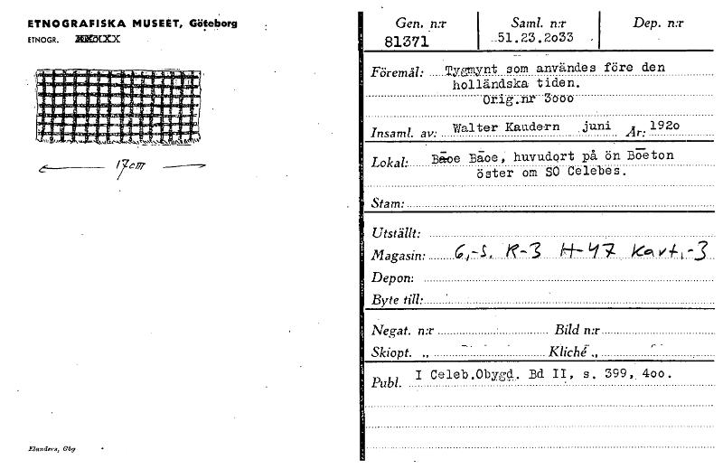 Gen. mr 81371 Samt. _51.23.2033 Dep. n:r Föremål: Tygmynt som användes före den holländska tiden. Grig,nr Insaml. av: Walter. Kaudern juni Ar: 192o Lokal: Ba-o e Ba-oe, huvudort på ön fjeton öster o...