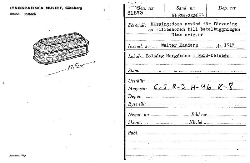 • ETNOGRAFISKA MUSEET, Göteborg ETNOGR. X41412K n:r 81573 Saml. n:r 51 Dep. n:r c------- Föremål: Mässingsdosa använd för förvaring av tillbehören till beteltuggningen Utan orig.nr Insaml. av: Walter... Visa hela
